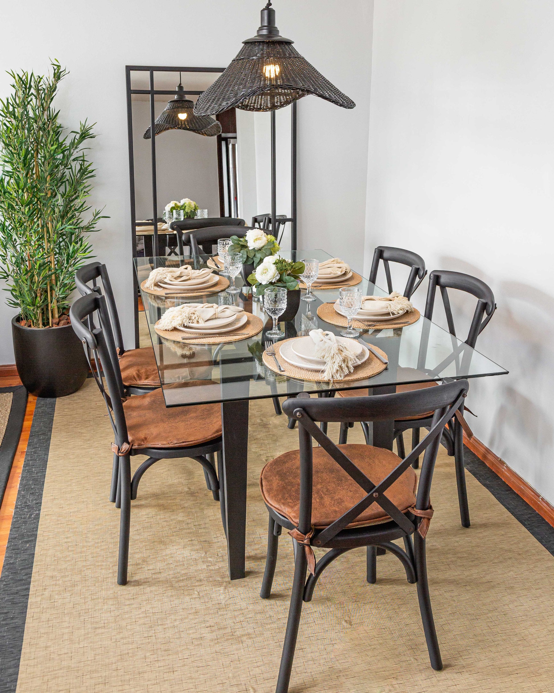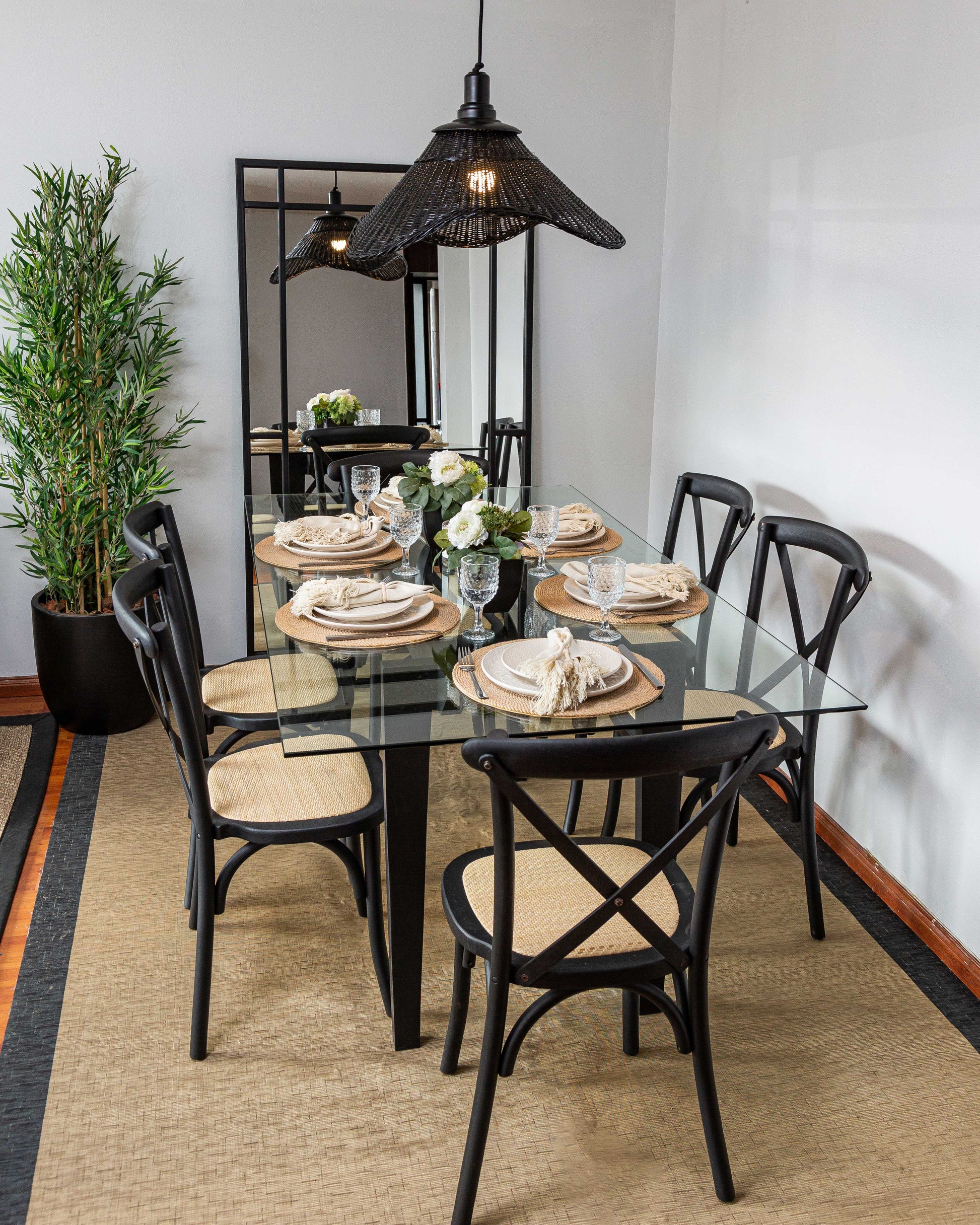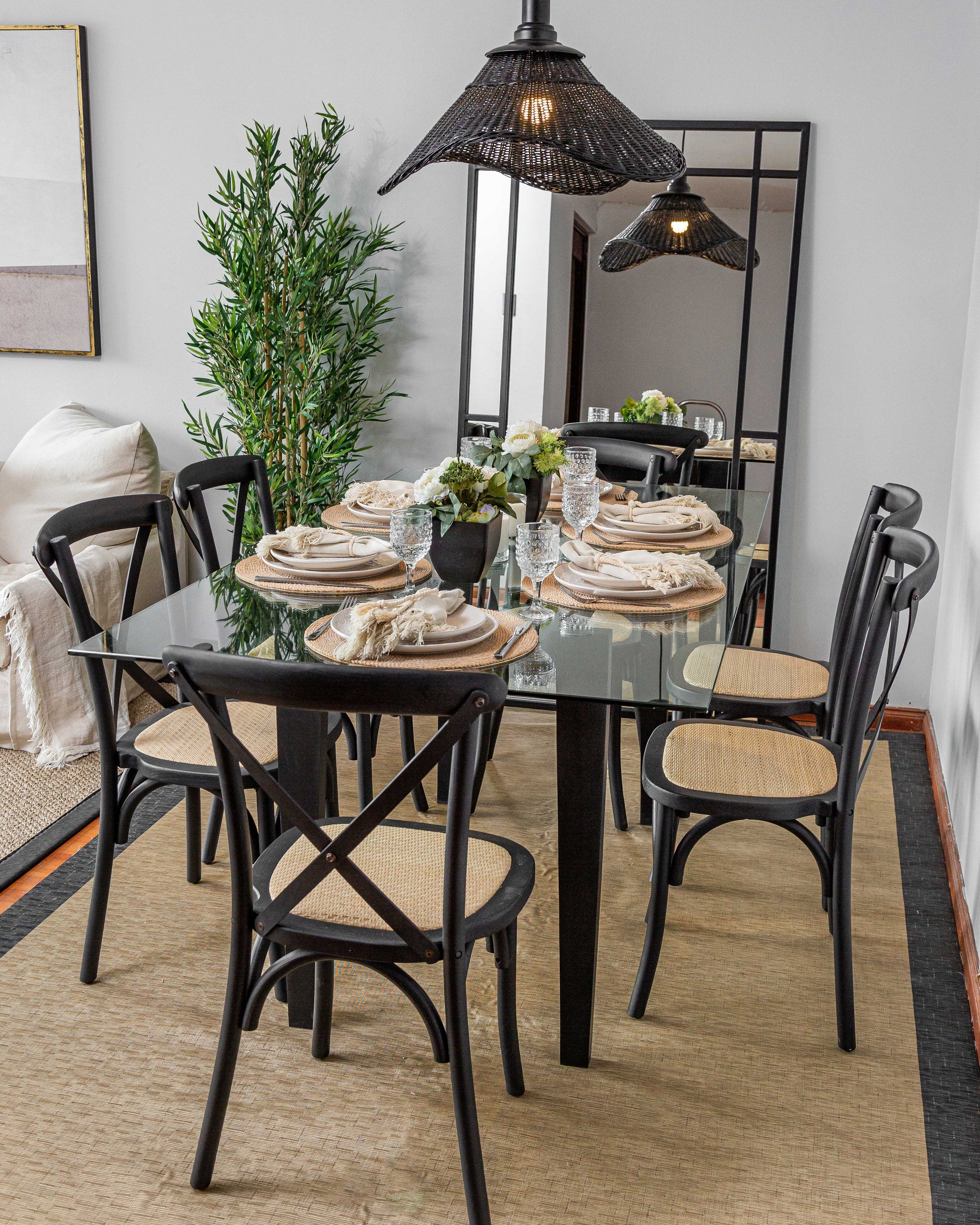 Su mesa con cubierta de vidrio templado refleja la luz y amplía visualmente el espacio, mientras las sillas en madera negra con asiento de junco natural aportan calidez y contraste.