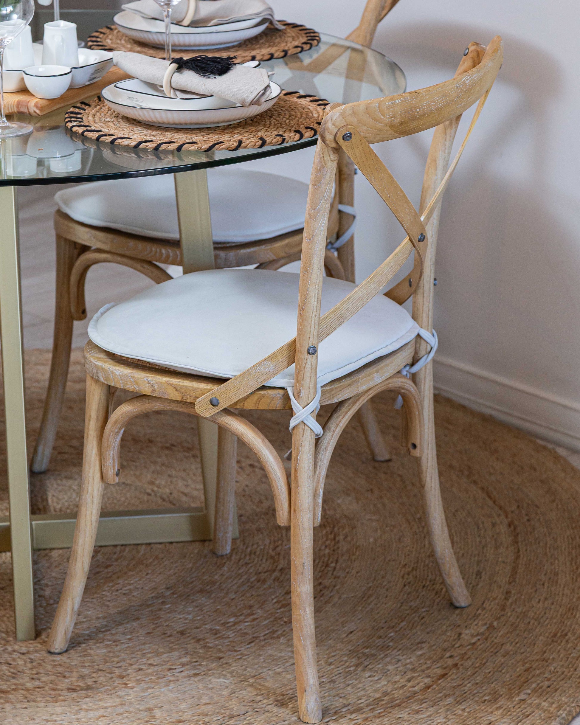 Su mesa de vidrio templado sobre estructura metálica dorada crea un equilibrio perfecto entre ligereza y sofisticación, mientras las sillas en madera clara con cojines blancos aportan comodidad y un aire fresco.
