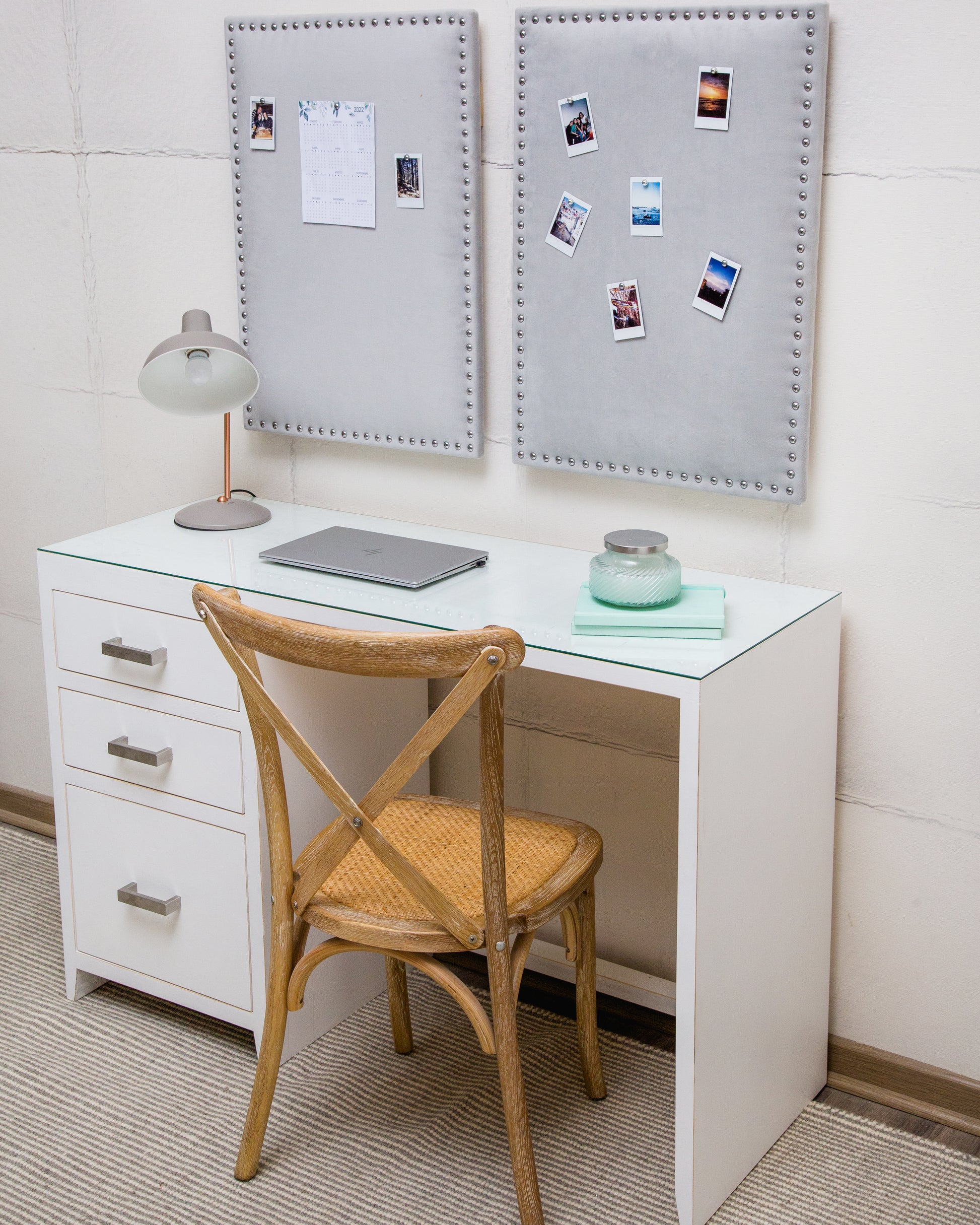Cuenta con una superficie amplia que entrega resistencia y un acabado limpio, además de tres cajones con asas roma plateadas que aportan un detalle moderno y práctico para mantener todo organizado.