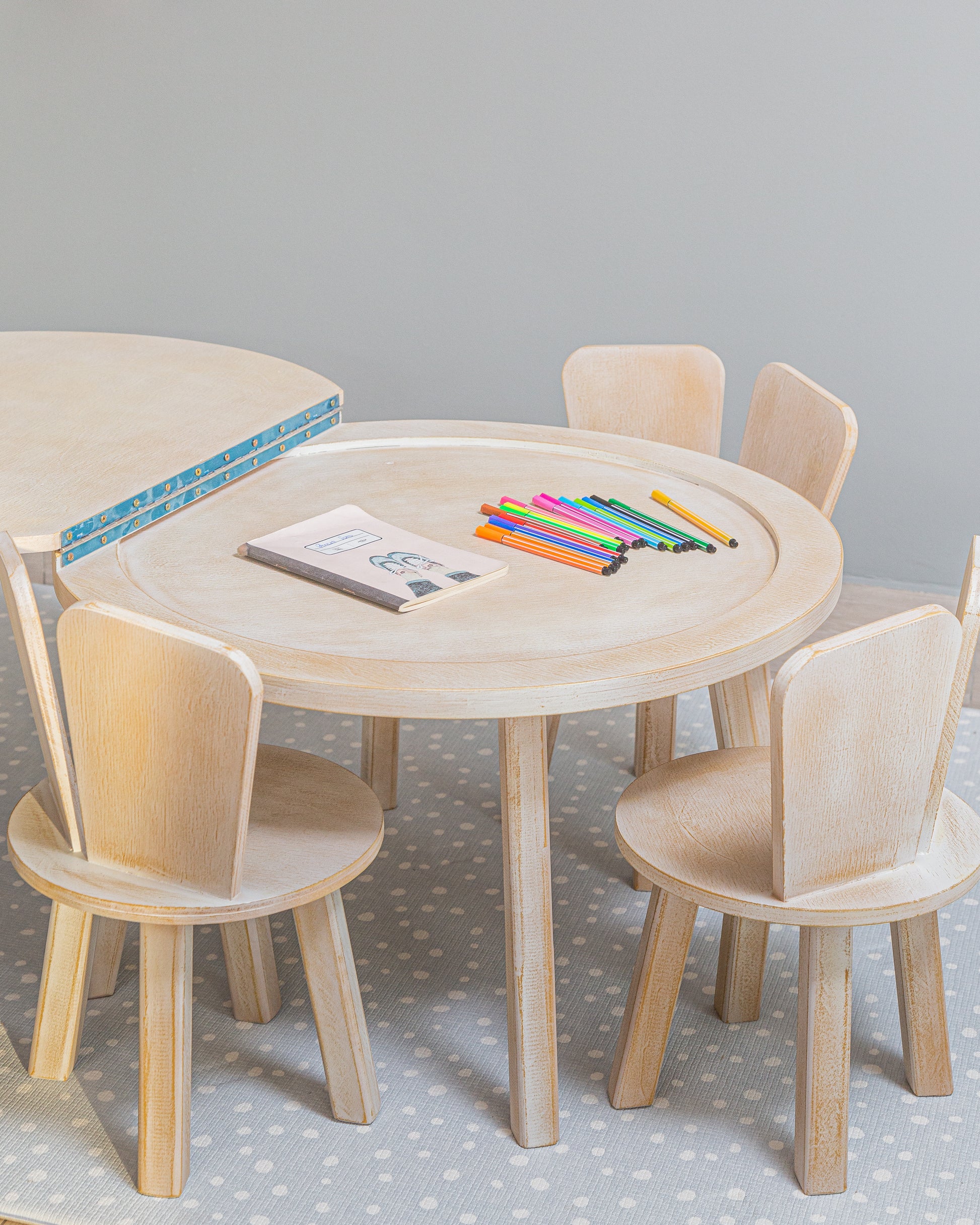 Este set infantil está conformado por una mesa redonda y cuatro sillas, ideal para que los niños puedan jugar, dibujar o compartir momentos creativos. Fabricado en madera sólida y acabado en color blanco, aporta luminosidad y combina con cualquier tipo de dormitorio o sala de juegos. Su diseño estable y de líneas suaves garantiza seguridad y confort para los más pequeños. Además, al ser un diseño hecho a medida, puede adaptarse en tamaño y color según las necesidades del espacio o la edad de los niños.
