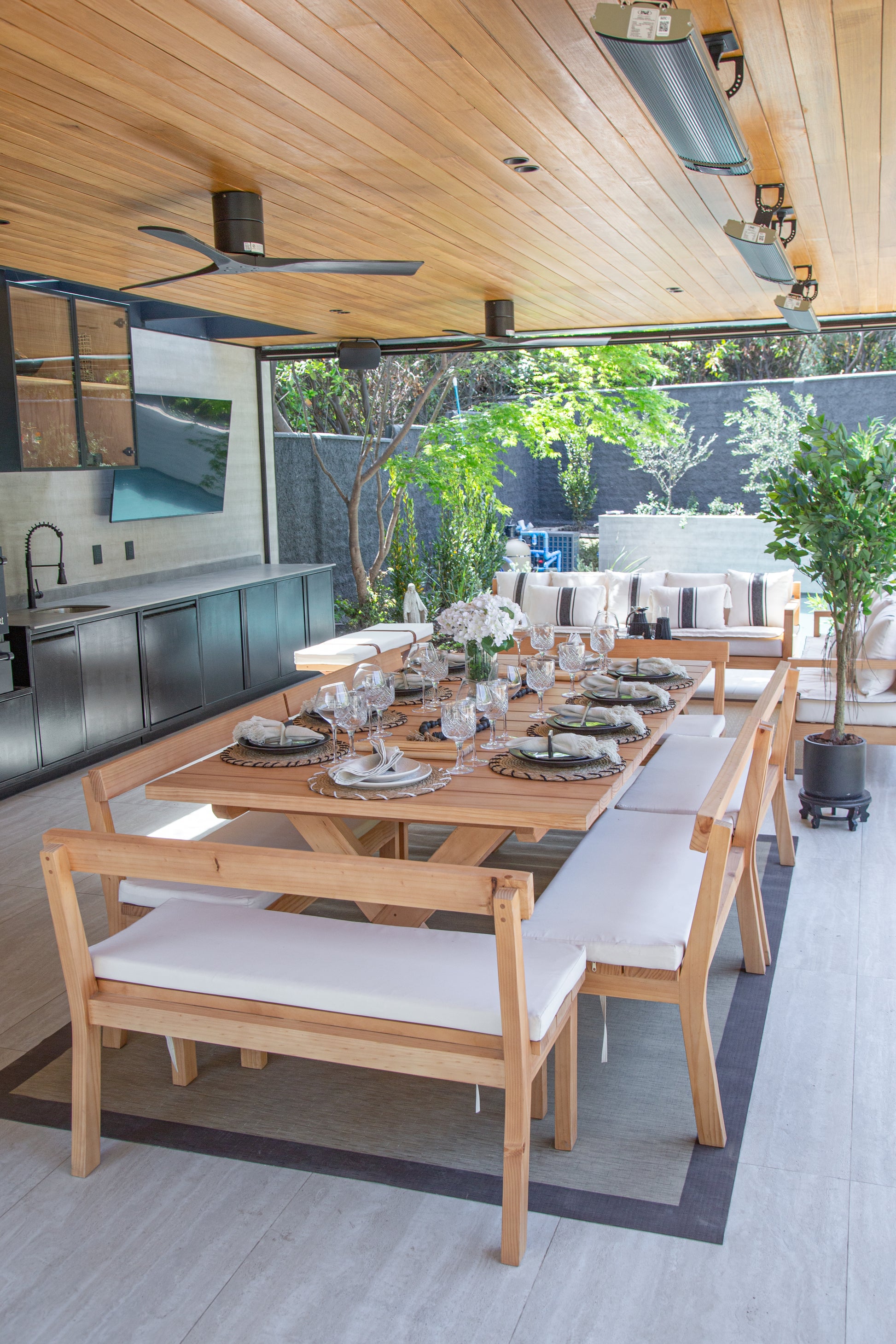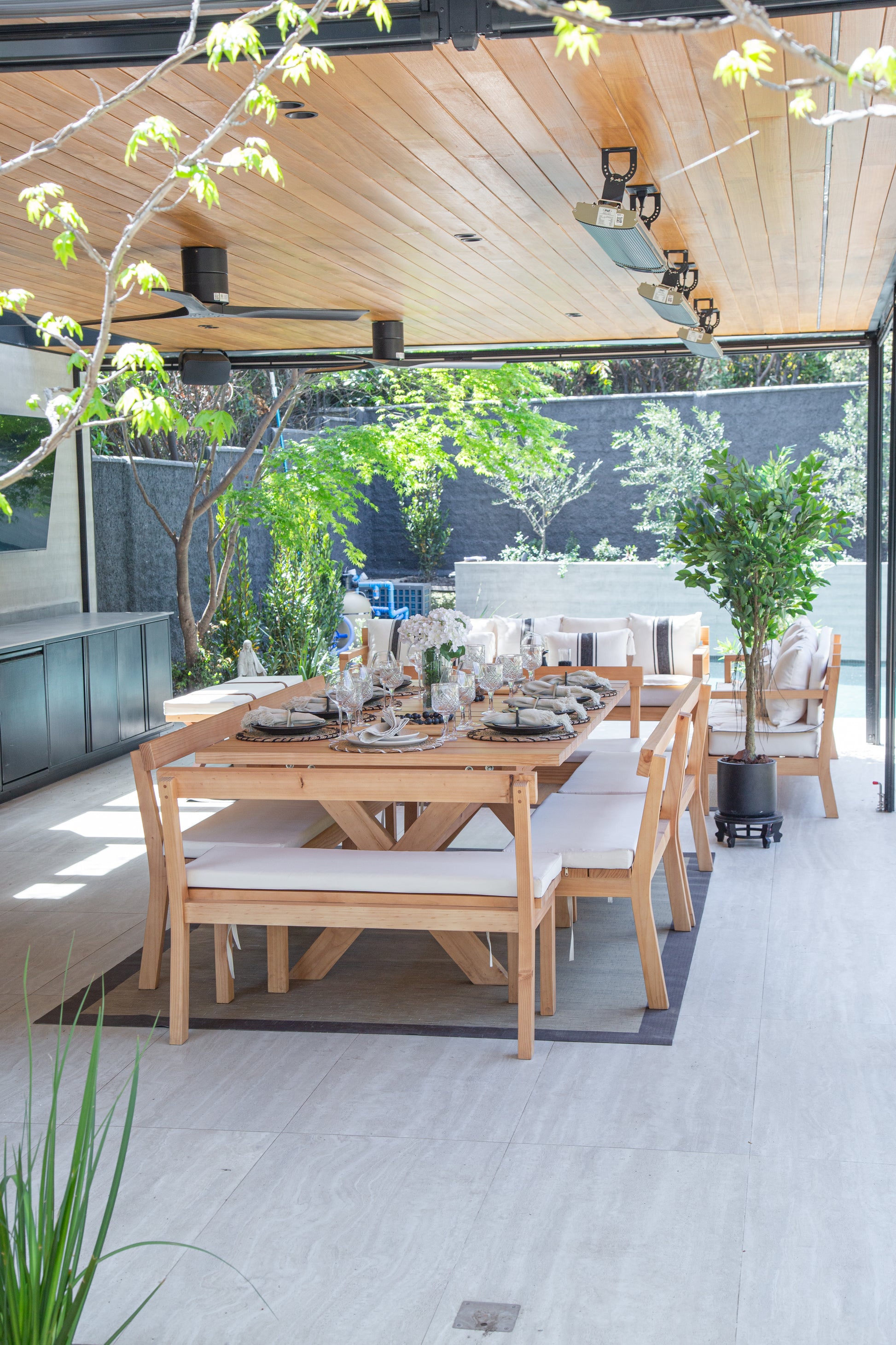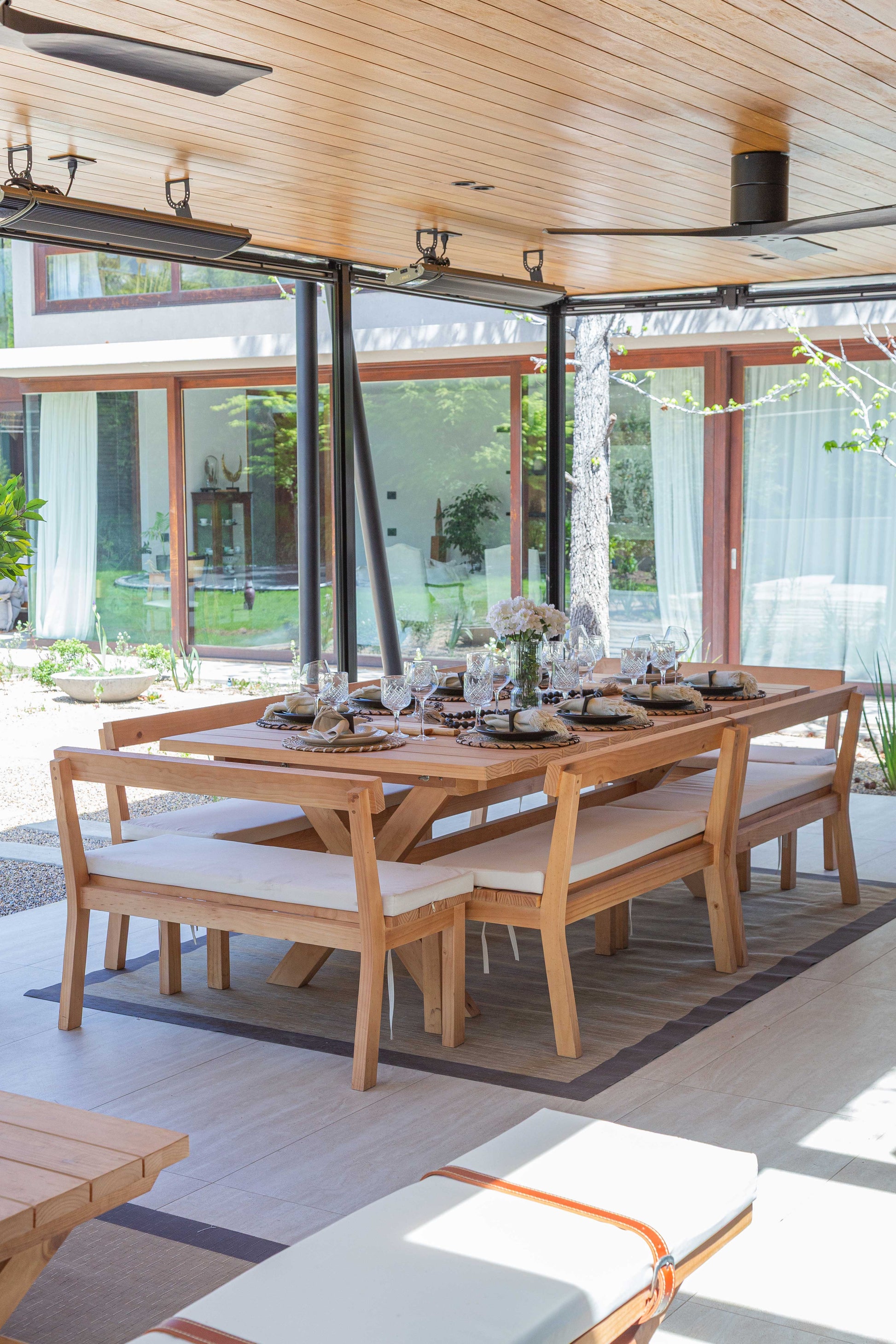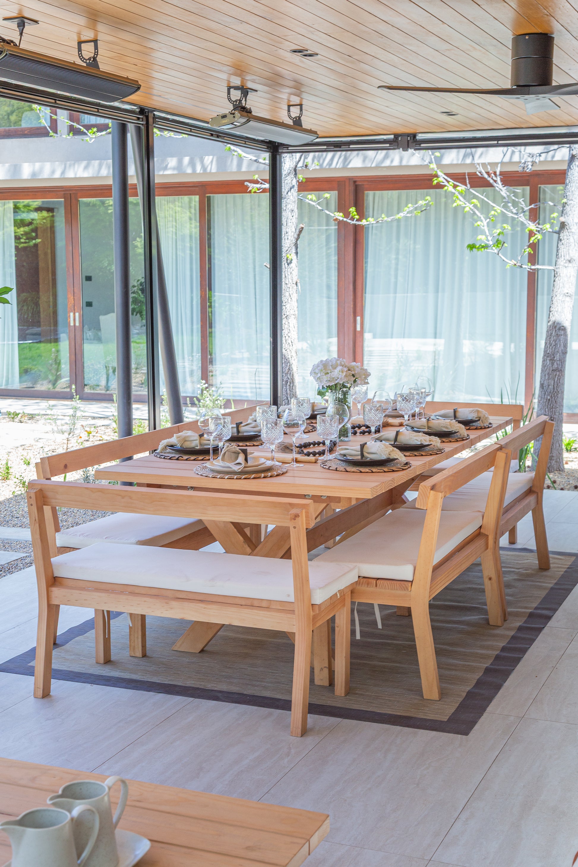 Su composición de madera natural genera una atmósfera cálida y contemporánea, perfecta para compartir en un espacio exterior pensado para la convivencia y el disfrute cotidiano.