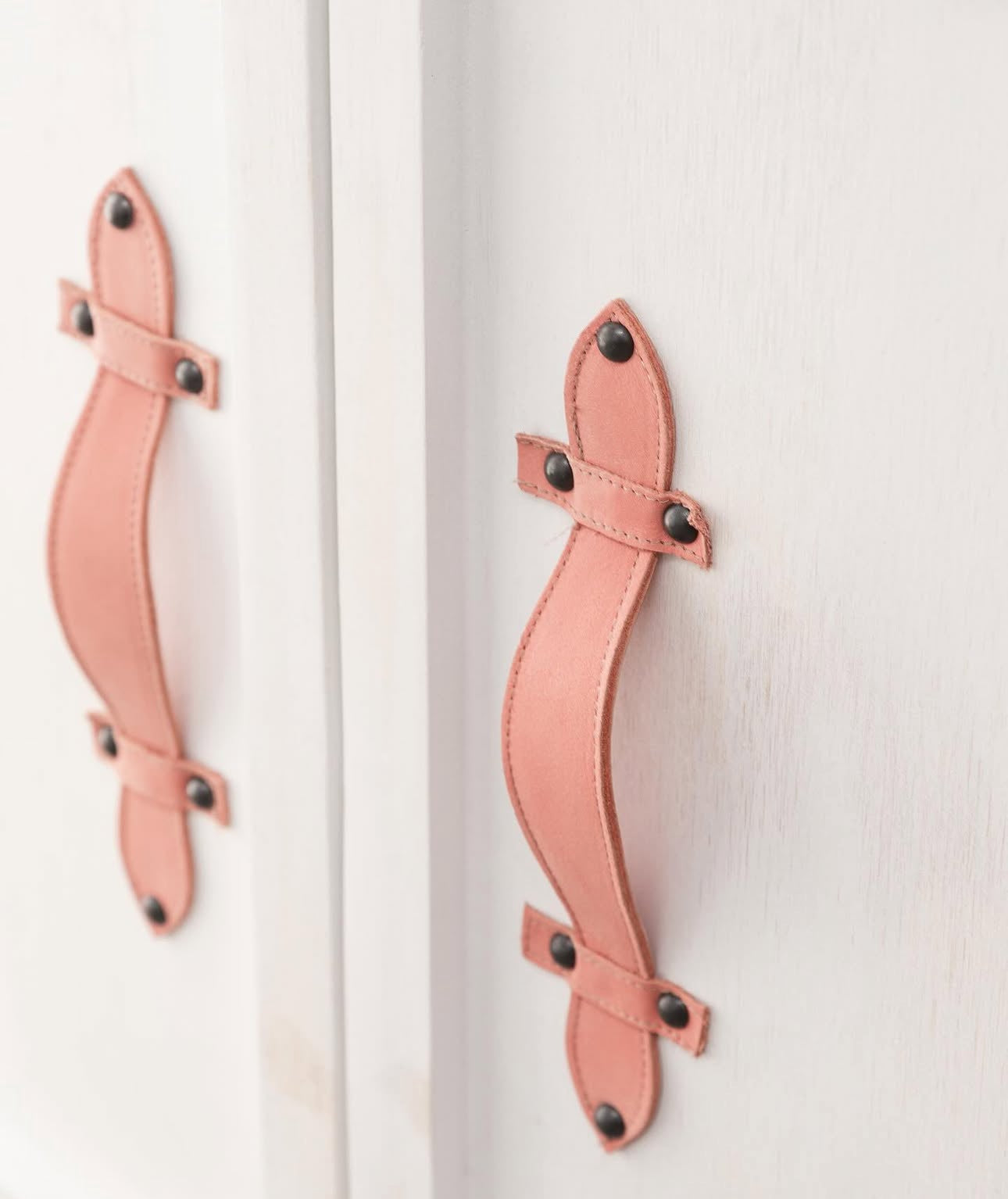 Rack en color blanco fabricado a medida, que cuenta con tres repisas amplias y abiertas ideales para organizar libros, decoración o elementos de uso diario, y en la parte baja incorpora dos puertas con asas de cuero que se pueden personalizar según la variedad de colores disponibles.