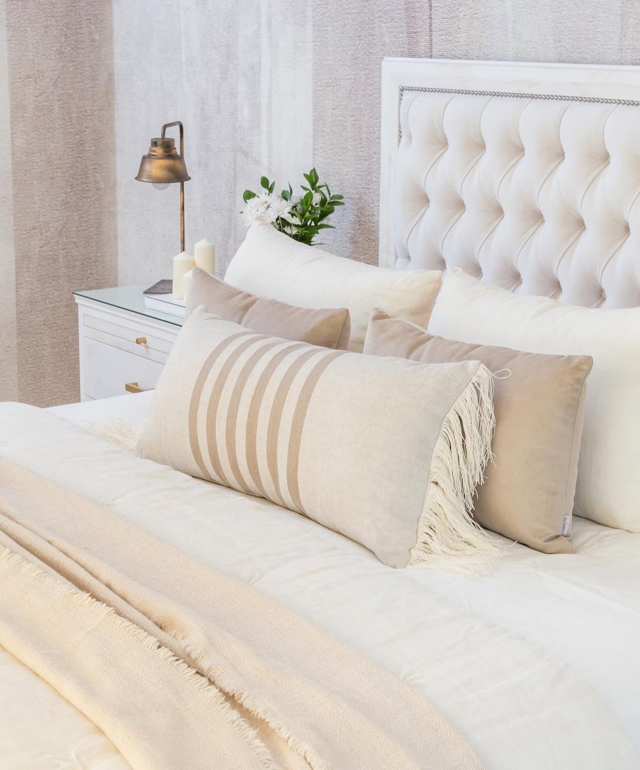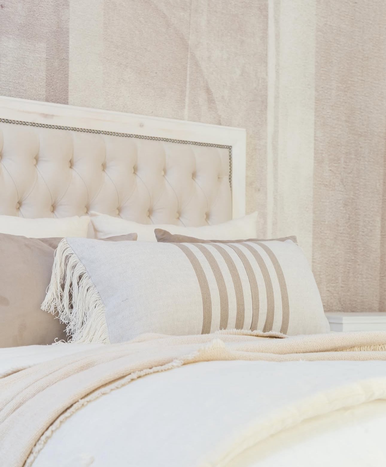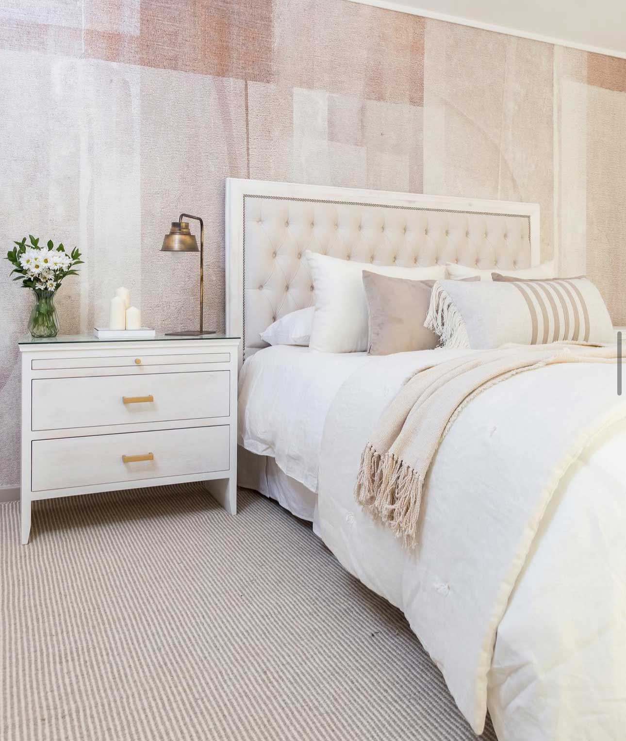 Este respaldo combina materiales y detalles que le dan presencia y equilibrio al dormitorio. Está tapizado en felpa color crudo, con un acabado capitoné que genera volumen y textura en el frente.