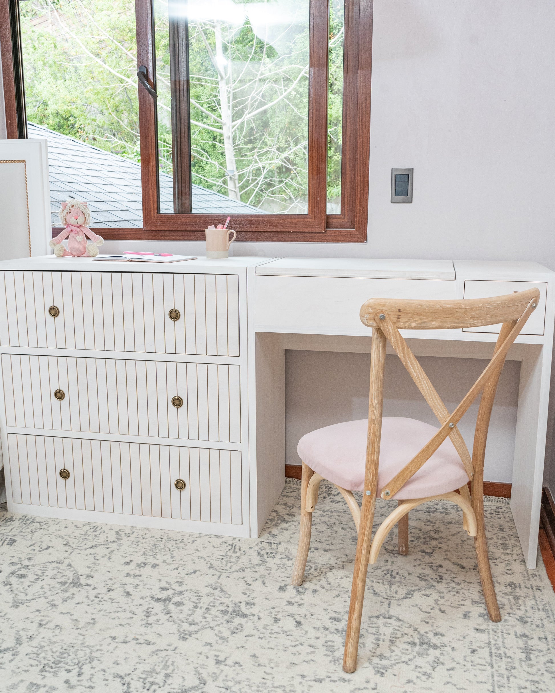 Tocador escritorio en blanco patinado, fabricado a medida por Rustic Chic para adaptarse a cualquier dormitorio o espacio de trabajo.