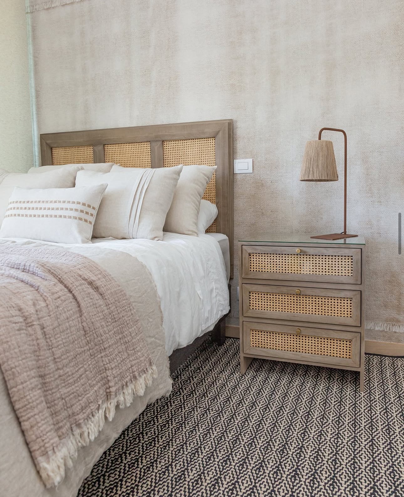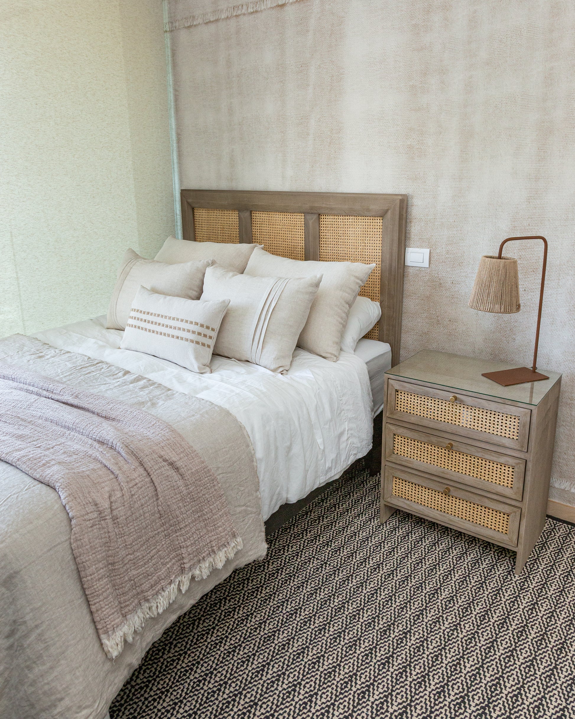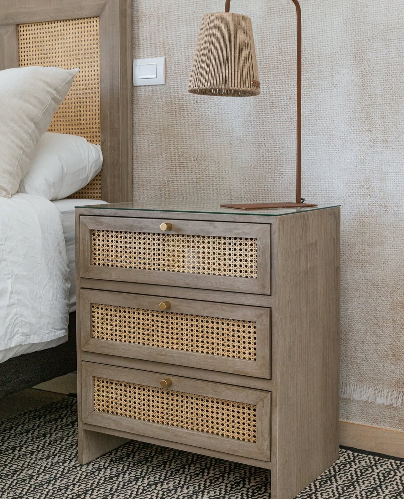 Cuenta con un bandejero superior con tirador dorado ideal para apoyar objetos de uso diario como libros o accesorios, junto a tres cajones con frentes en junco natural que aportan textura artesanal y asas roma doradas que realzan el diseño con un detalle sofisticado.