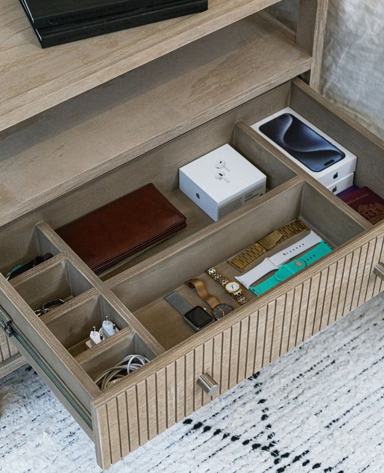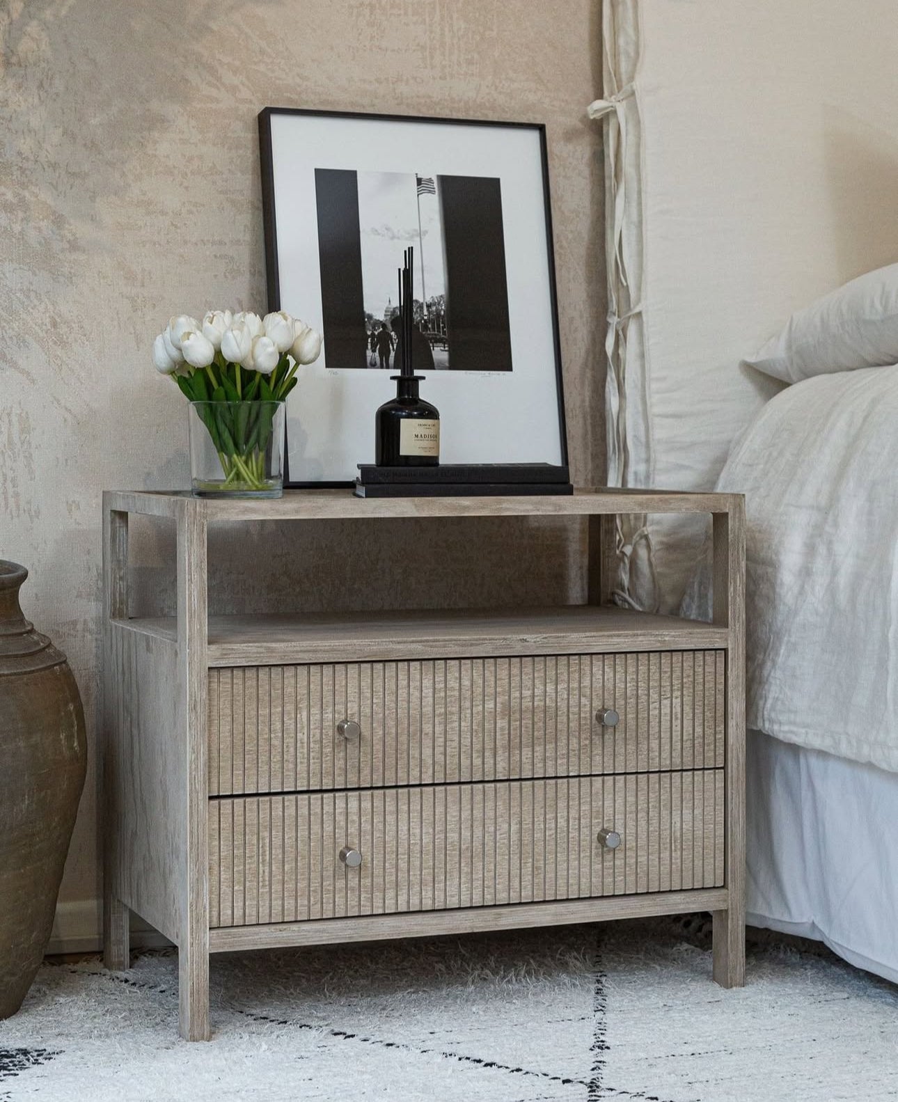 Incluye dos cajones con frentes texturizados y tiradores plateados que aportan un detalle moderno y elegante, además de un compartimiento superior abierto ideal para apoyar libros, accesorios o elementos decorativos.