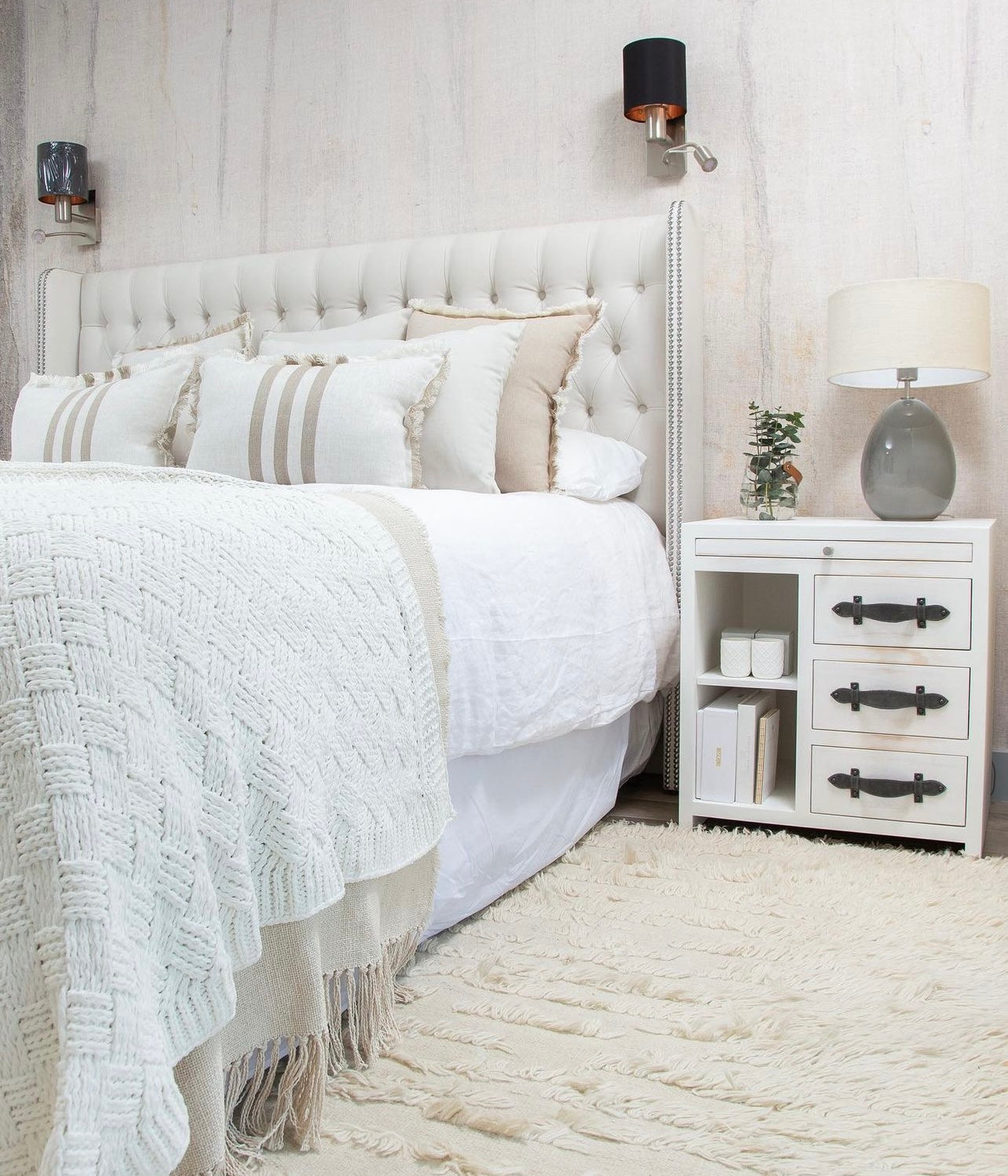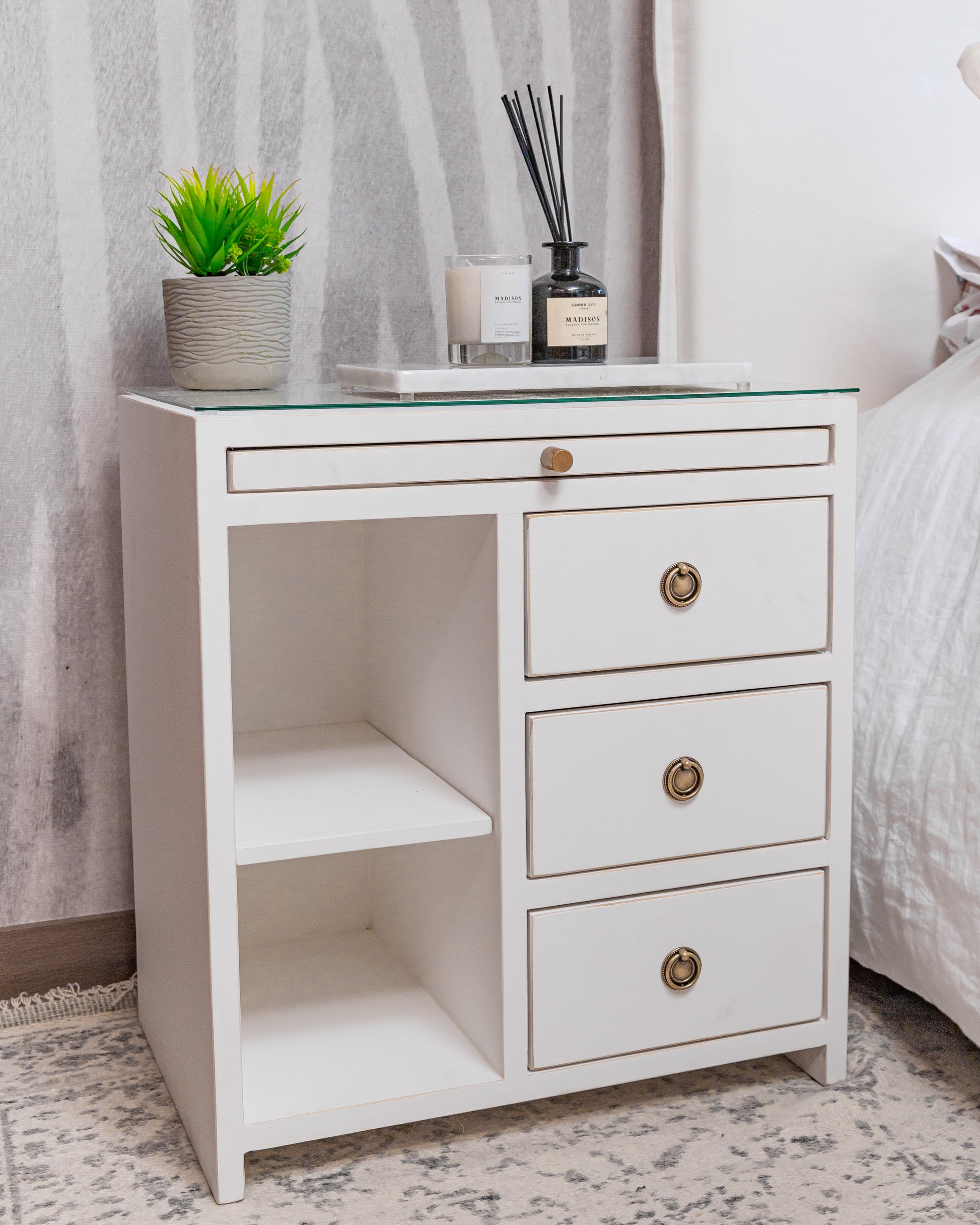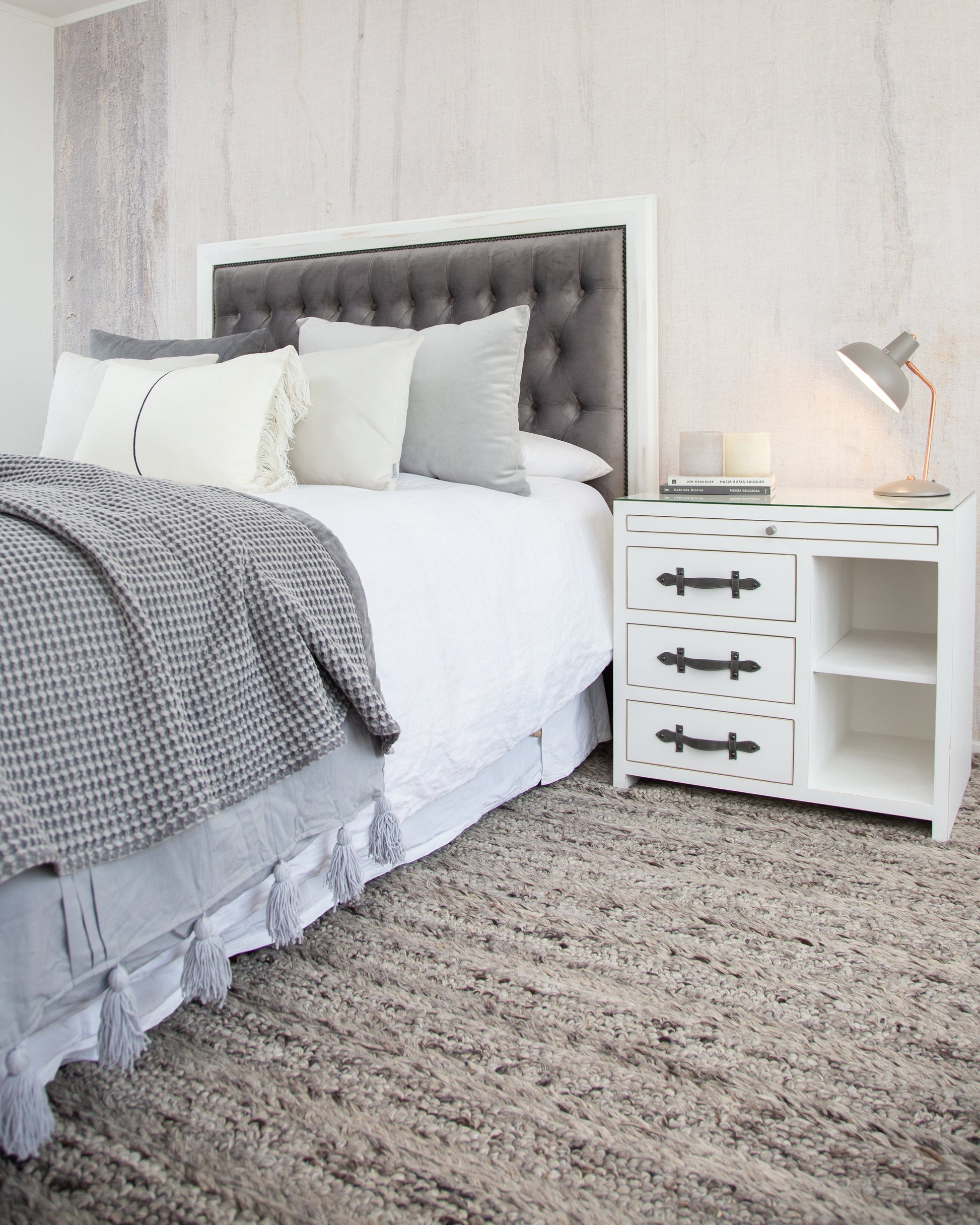 Velador en color gris perla patinado hecho a medida por Rustic Chic, diseñado para adaptarse a cualquier dormitorio con estilo y funcionalidad.