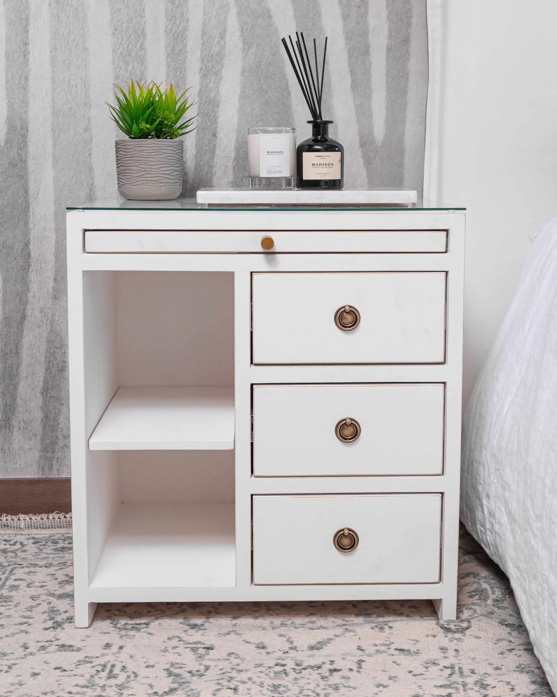 Fabricado en madera, cuenta con tres cajones con tiradores de argolla envejecida que aportan un aire clásico y elegante, además de un espacio abierto lateral ideal para organizar libros, accesorios o elementos decorativos.